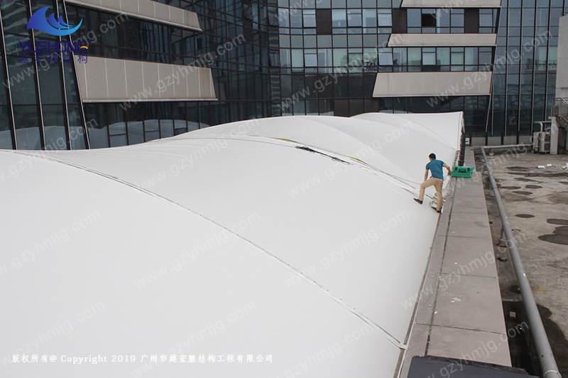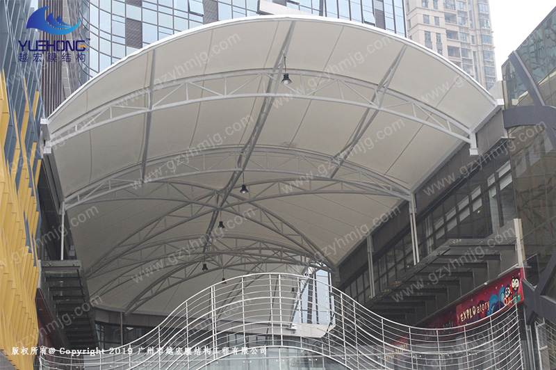 此款膜結構遮陽棚,我司能夠提前工程驗收安全保質,確定了膜結構安裝穩(wěn)固與使用安全,在我司施工隊團結精神,專業(yè)的安裝技術方面,能盡快的完成了施工工作。以其獨有的優(yōu)美曲線造型和獨有透光率的遮陽棚,能提升了商業(yè)區(qū)的美觀與恰好的實用。